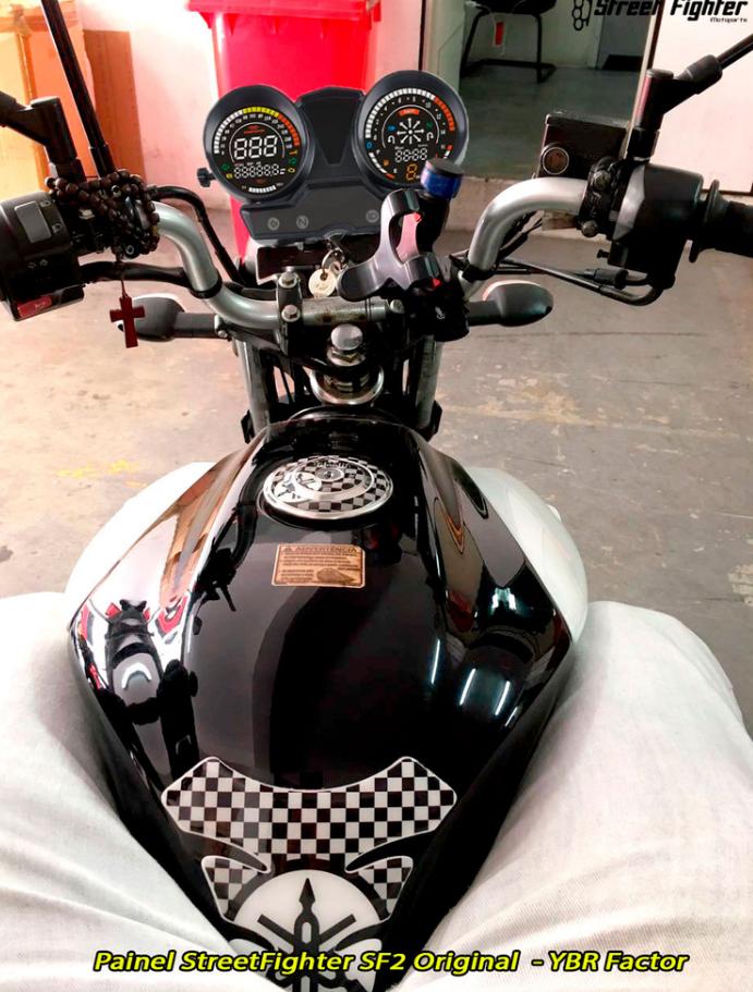 o SF Factor é um modelo feito para a YBR ou YBR fator de farol redondo, funciona tudo nela e adiciona funções interessantes como navegador GPS que mostra o caminho onde você deve seguir para chegar ao seu destino, luzes de óleo, manutenção, e até temperatura, este modelo é uma derivação do SF125 que é um modelo desenvolvido para motos grandes, com tudo o que a sua moto pode pensar em precisar e adaptado na carcaça da YBR factor